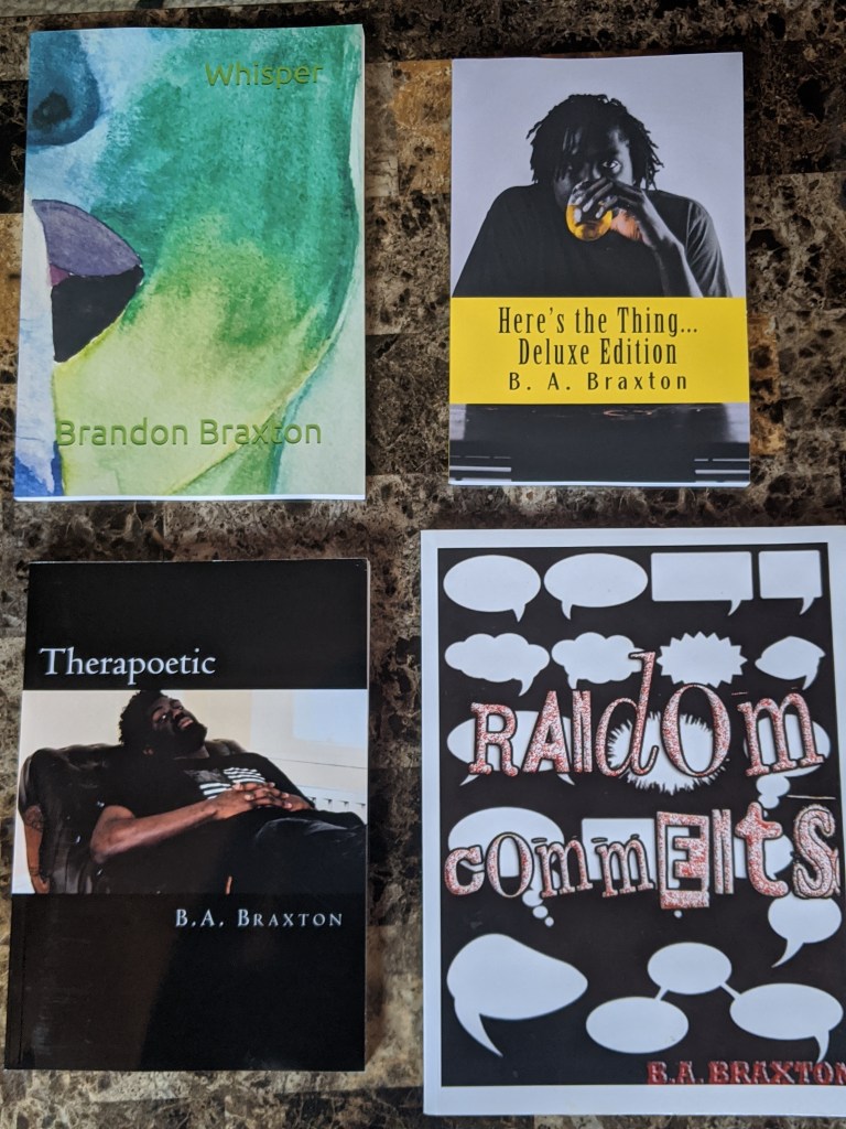 Though my sample size is small today, it boggles my mind that I have put together three poetry collections and a novella. As I sat there and stared at the books, I felt a surge of pride. I remember when I asked a coworker to help me put together Random Comments (thanks Ebony!)–everything was so new to me. I never thought that I would have a chance to publish all those poems I wrote over 4 years in college. But once I got over that hurdle, there has been no looking back. I’ve gotten better with every book with every release and my hope is that as I continue on this journey, you’ll help push me where I want to be!